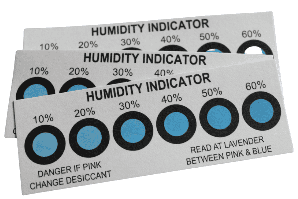 - Thẻ hiển thị độ ẩm là tấm thẻ có những chấm tròn trên đó và những vòng tròn này có thể đổi màu. Thẻ được ngâm tẩm chất ẩm nhạy cảm và sẽ bị biến đổi màu sắc khi mức độ ẩm tương đối vượt qua sự cho phép.